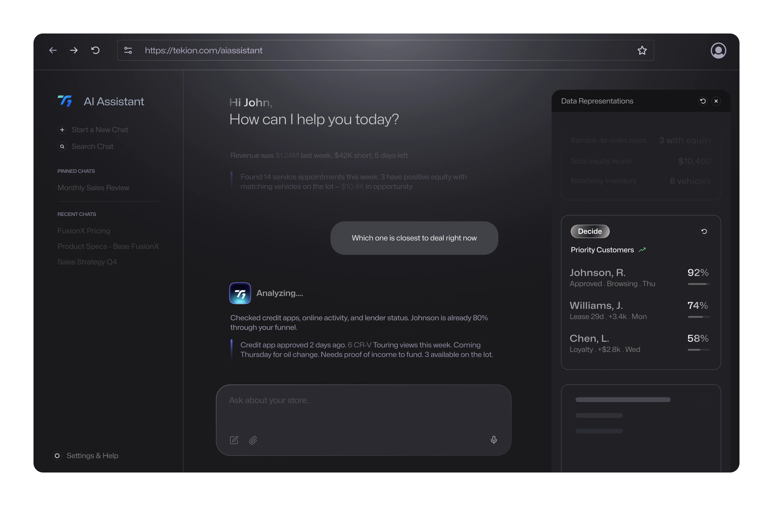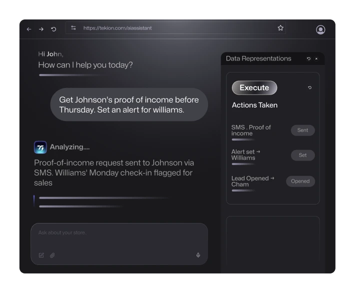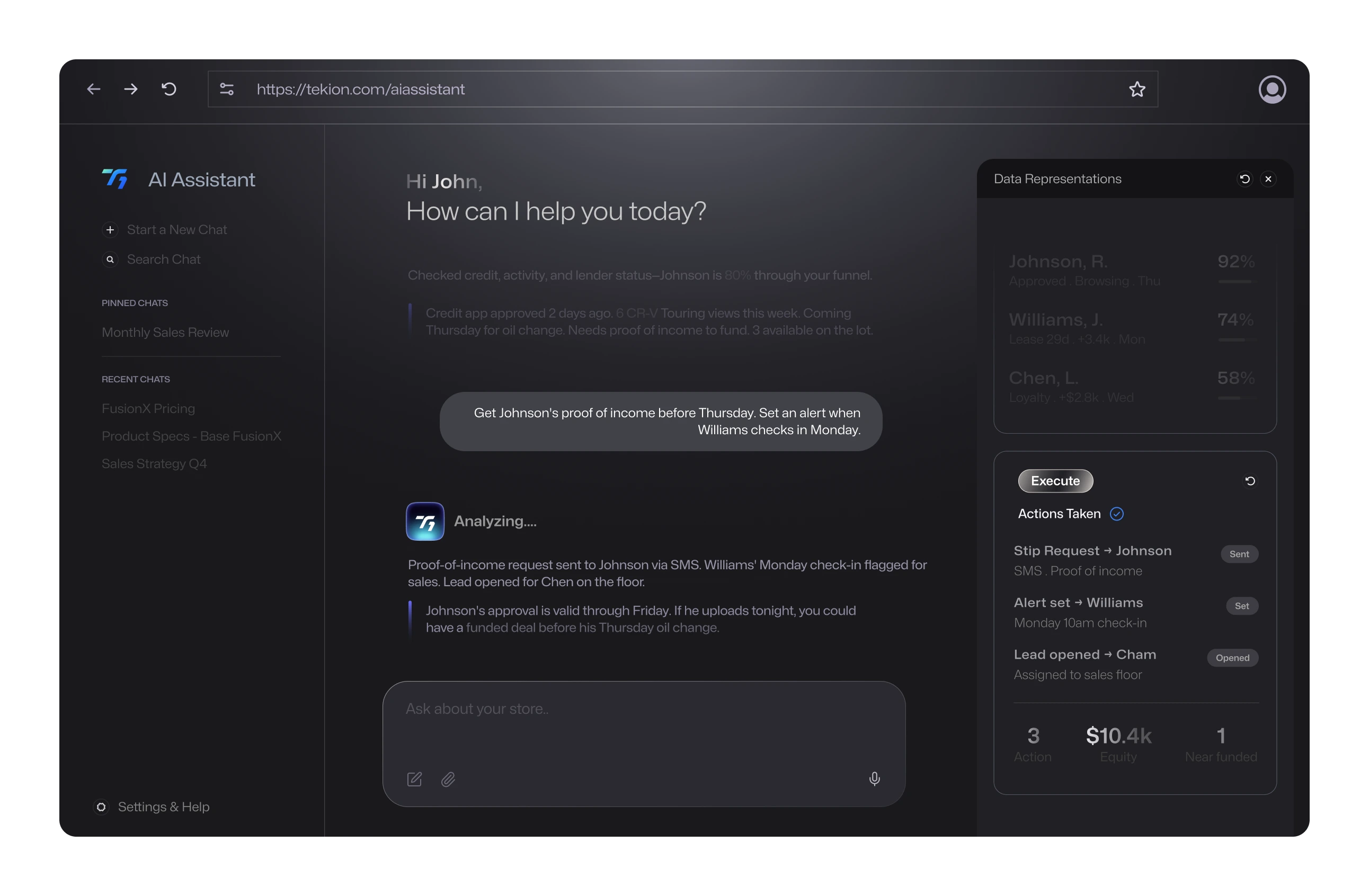 AI-native and built on a secure, unified data foundation, the platform connects every customer, vehicle, deal, and financial record across your dealership. Tekion activates that intelligence in a single interface called T1, that understands, guides, and executes—seamlessly within your workflows.