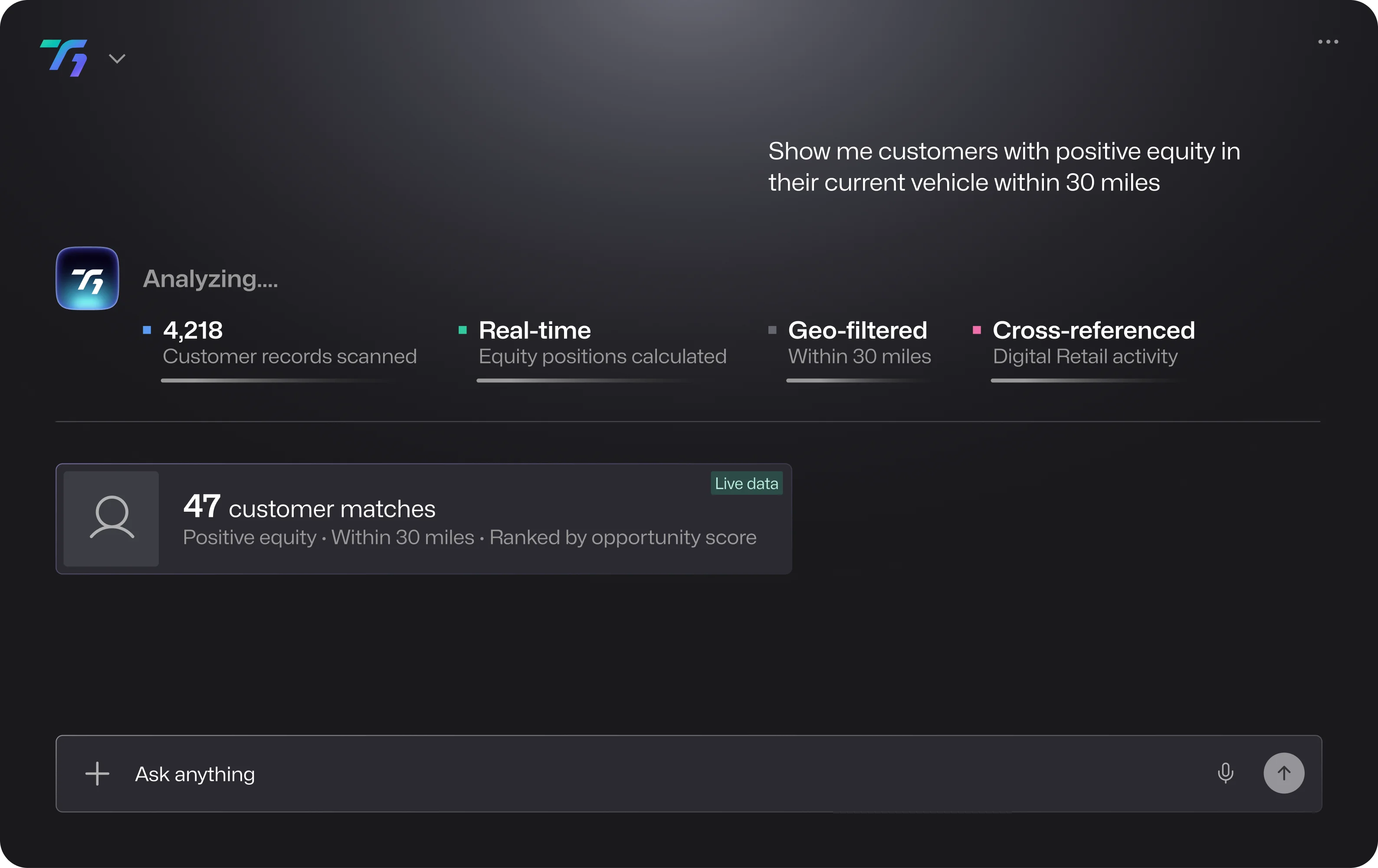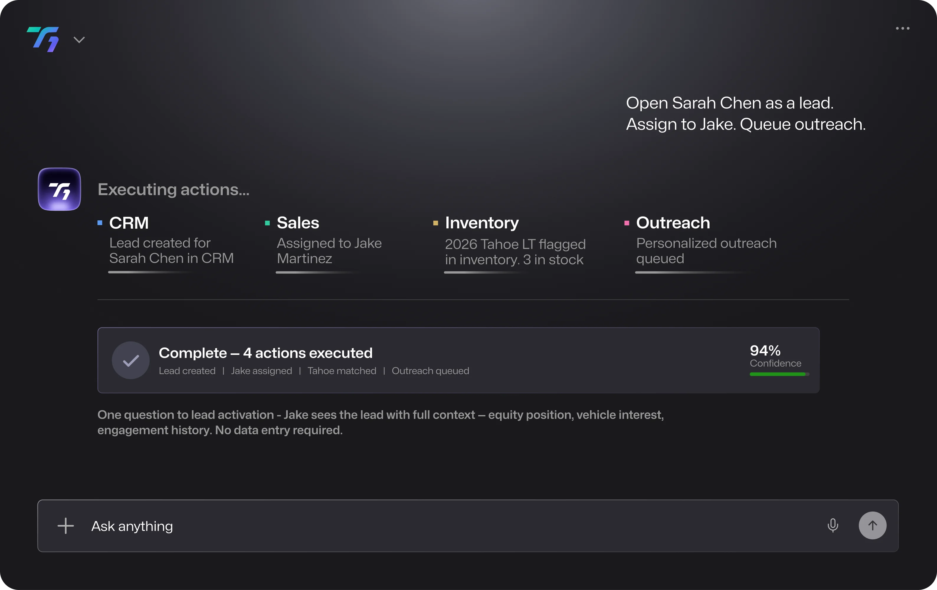 With T1 as the primary interface, teams can ask questions, surface insights, and take action across customers, vehicles, deals, and repair orders—without jumping between systems.