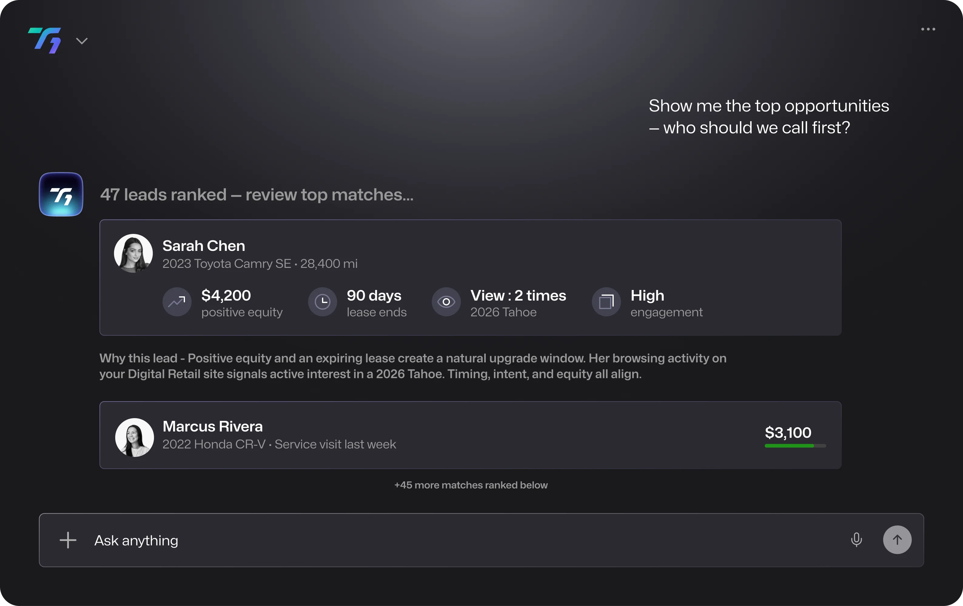 T1 analyzes real-time dealership data, surfaces insights, and ranks results—so your team can make faster, more informed decisions with full business context.